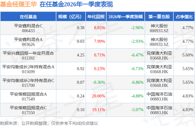 从基金规模来看,平安策略回报混合A基金2026年一季度公布的基金规模为0.24亿元,较上一期规模3023.9万元变化了-617.32万元,环比变化了-20.41%。该基金最新一期资产配置为:股票占净值比90.02%,无债券类资产,现金占净值比10.34%。从基金持仓来看,该基金当季前十大股票仓位达41.04%,第一大重仓股为中国海洋石油(00883),持仓占比为4.83%。