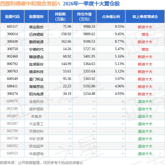 从基金规模来看,西部利得碳中和混合发起A基金2026年一季度公布的基金规模为6.0亿元,较上一期规模6.37亿元变化了-3704.09万元,环比变化了-5.81%。该基金最新一期资产配置为:股票占净值比94.09%,无债券类资产,现金占净值比7.62%。从基金持仓来看,该基金当季前十大股票仓位达63.61%,第一大重仓股为德业股份(605117),持仓占比为9.55%。