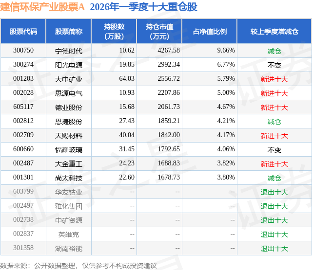 从基金规模来看,建信环保产业股票A基金2026年一季度公布的基金规模为4.33亿元,较上一期规模4.35亿元变化了-203.83万元,环比变化了-0.47%。该基金最新一期资产配置为:股票占净值比91.1%,无债券类资产,现金占净值比9.26%。从基金持仓来看,该基金当季前十大股票仓位达51.95%,第一大重仓股为宁德时代(300750),持仓占比为9.66%。