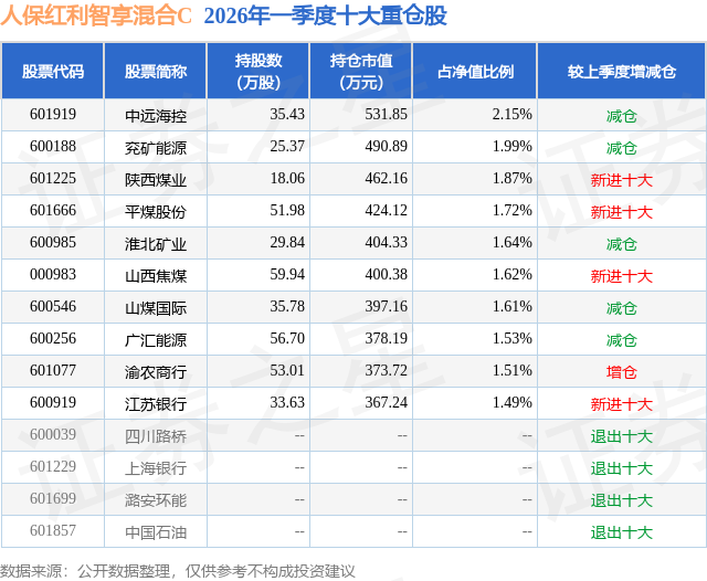 从基金规模来看,人保红利智享混合C基金2026年一季度公布的基金规模为0.11亿元。该基金最新一期资产配置为:股票占净值比92.08%,债券占净值比4.11%,现金占净值比3.59%。从基金持仓来看,该基金当季前十大股票仓位达17.13%,第一大重仓股为中远海控(601919),持仓占比为2.15%。