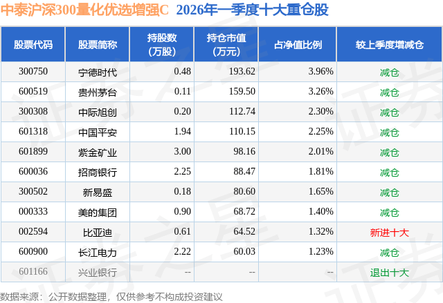 证券之星消息,日前中泰沪深300量化优选增强C基金公布一季报,2026年一季度最新规模0.24亿元,季度净值涨幅为-3.83%。