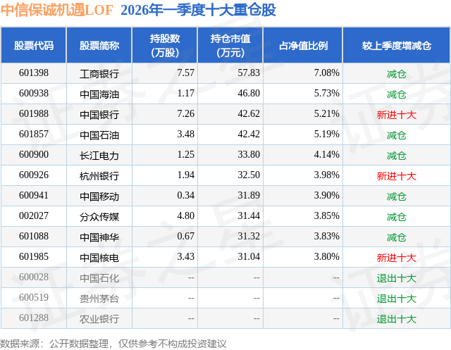 证券之星消息,日前中信保诚机遇LOF基金公布一季报,2026年一季度最新规模0.08亿元,季度净值涨幅为-0.99%。