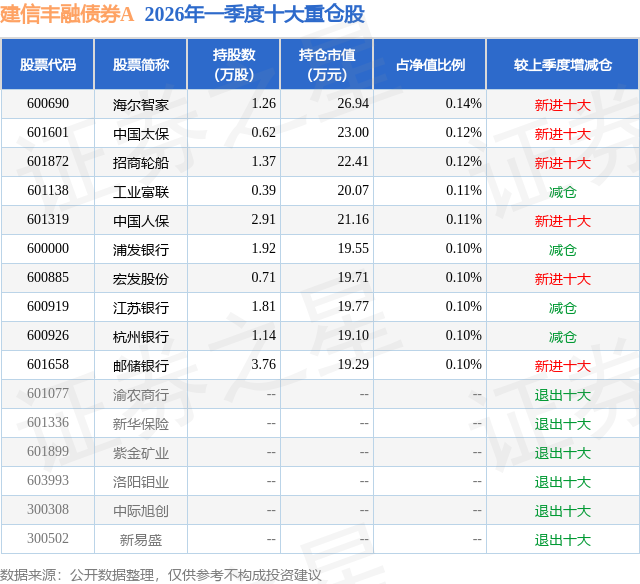 从基金规模来看,建信丰融债券A基金2026年一季度公布的基金规模为1.24亿元。该基金最新一期资产配置为:股票占净值比16.16%,债券占净值比94.07%,现金占净值比1.66%。从基金持仓来看,该基金当季前十大股票仓位达1.1%,第一大重仓股为海尔智家(600690),持仓占比为0.14%。