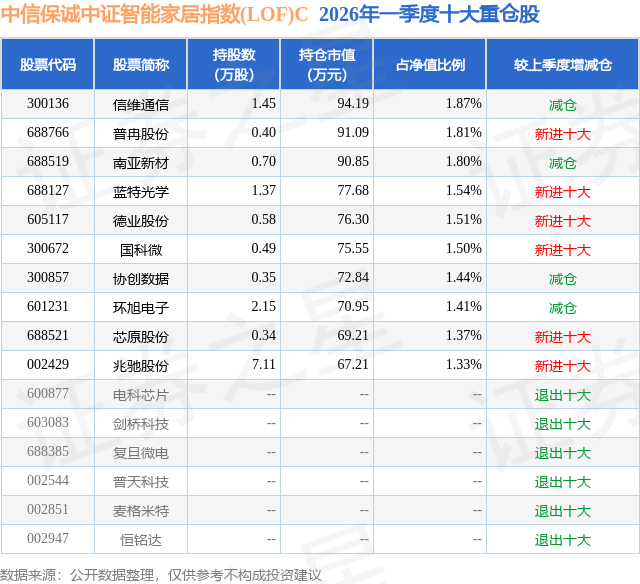 从基金规模来看,中信保诚中证智能家居指数(LOF)C基金2026年一季度公布的基金规模为0.13亿元,较上一期规模1508.41万元变化了-166.45万元,环比变化了-11.03%。该基金最新一期资产配置为:股票占净值比94.03%,无债券类资产,现金占净值比6.27%。从基金持仓来看,该基金当季前十大股票仓位达15.58%,第一大重仓股为信维通信(300136),持仓占比为1.87%。