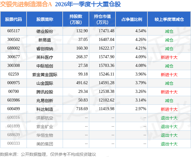 从基金规模来看,交银先进制造混合A基金2026年一季度公布的基金规模为37.45亿元,较上一期规模52.12亿元变化了-14.67亿元,环比变化了-28.14%。该基金最新一期资产配置为:股票占净值比77.67%,债券占净值比6.03%,现金占净值比17.33%。从基金持仓来看,该基金当季前十大股票仓位达38.3%,第一大重仓股为德业股份(605117),持仓占比为4.54%。