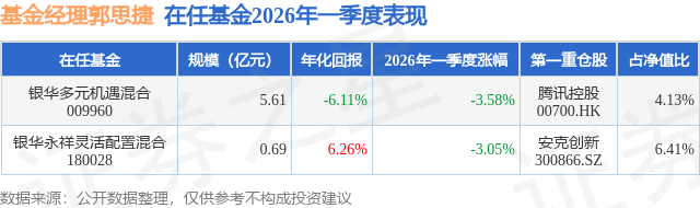证券之星消息,日前银华永祥灵活配置混合基金公布一季报,2026年一季度最新规模0.69亿元,季度净值涨幅为-3.05%。