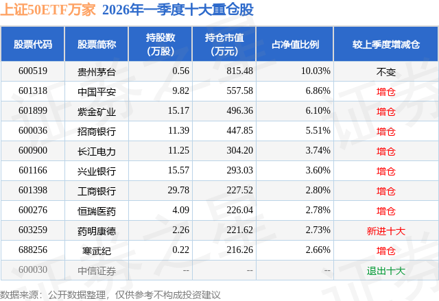 从基金规模来看,上证50ETF万家基金2026年一季度公布的基金规模为0.81亿元,较上一期规模8595.33万元变化了-464.22万元,环比变化了-5.4%。该基金最新一期资产配置为:股票占净值比98.95%,无债券类资产,现金占净值比1.06%。从基金持仓来看,该基金当季前十大股票仓位达46.81%,第一大重仓股为贵州茅台(600519),持仓占比为10.03%。