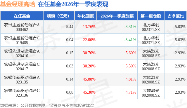 从基金规模来看,农银主题轮动混合A基金2026年一季度公布的基金规模为5.44亿元,较上一期规模4.81亿元变化了6247.43万元,环比变化了12.98%。该基金最新一期资产配置为:股票占净值比85.33%,无债券类资产,现金占净值比16.07%。从基金持仓来看,该基金当季前十大股票仓位达38.48%,第一大重仓股为北方华创(002371),持仓占比为5.03%。