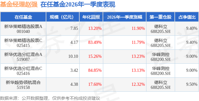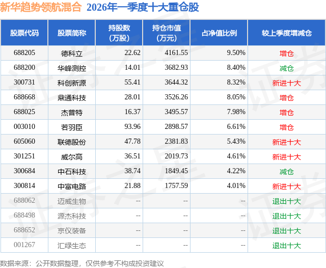 从基金规模来看,新华趋势领航混合基金2026年一季度公布的基金规模为4.38亿元,较上一期规模2.08亿元变化了2.31亿元,环比变化了111.14%。该基金最新一期资产配置为:股票占净值比94.28%,债券占净值比2.26%,现金占净值比3.62%。从基金持仓来看,该基金当季前十大股票仓位达67.13%,第一大重仓股为德科立(688205),持仓占比为9.5%。