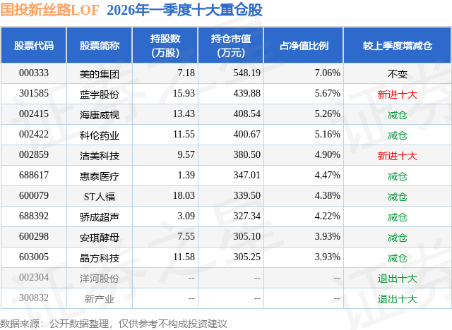 从基金规模来看,国投新丝路LOF基金2026年一季度公布的基金规模为0.78亿元,较上一期规模7796.29万元变化了-36.66万元,环比变化了-0.47%。该基金最新一期资产配置为:股票占净值比93.56%,债券占净值比0.26%,现金占净值比7.32%。从基金持仓来看,该基金当季前十大股票仓位达48.98%,第一大重仓股为美的集团(000333),持仓占比为7.06%。