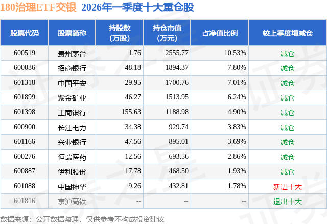 从基金规模来看,180治理ETF交银基金2026年一季度公布的基金规模为2.43亿元,较上一期规模2.55亿元变化了-1267.86万元,环比变化了-4.96%。该基金最新一期资产配置为:股票占净值比97.73%,无债券类资产,现金占净值比2.34%。从基金持仓来看,该基金当季前十大股票仓位达50.57%,第一大重仓股为贵州茅台(600519),持仓占比为10.53%。