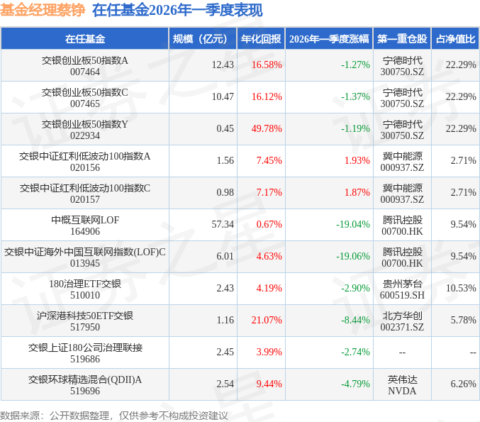 证券之星消息,日前180治理ETF交银基金公布一季报,2026年一季度最新规模2.43亿元,季度净值涨幅为-2.9%。