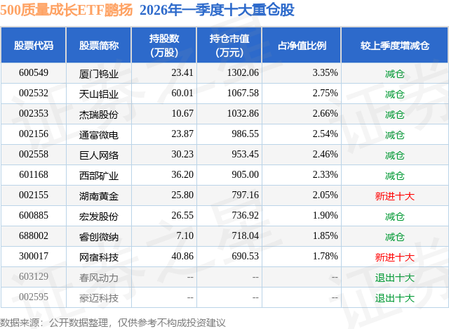 从基金规模来看,500质量成长ETF鹏扬基金2026年一季度公布的基金规模为3.88亿元,较上一期规模4.75亿元变化了-8650.68万元,环比变化了-18.22%。该基金最新一期资产配置为:股票占净值比99.14%,无债券类资产,现金占净值比0.6%。从基金持仓来看,该基金当季前十大股票仓位达23.67%,第一大重仓股为厦门钨业(600549),持仓占比为3.35%。