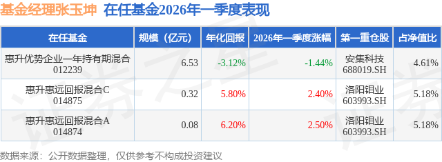 从基金规模来看,惠升惠远回报混合A基金2026年一季度公布的基金规模为0.08亿元,较上一期规模3200.83万元变化了-2389.3万元,环比变化了-74.65%。该基金最新一期资产配置为:股票占净值比71.88%,债券占净值比13.76%,现金占净值比14.67%。从基金持仓来看,该基金当季前十大股票仓位达43.22%,第一大重仓股为洛阳钼业(603993),持仓占比为5.18%。
