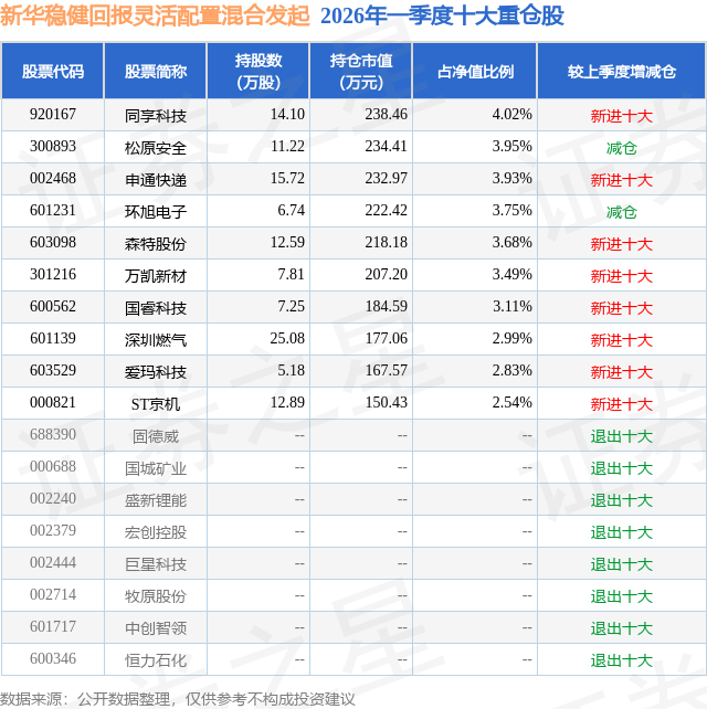 从基金规模来看,新华稳健回报灵活配置混合发起基金2026年一季度公布的基金规模为0.59亿元,较上一期规模5940.82万元变化了-11.03万元,环比变化了-0.19%。该基金最新一期资产配置为:股票占净值比45.56%,债券占净值比4.96%,现金占净值比50.56%。从基金持仓来看,该基金当季前十大股票仓位达34.29%,第一大重仓股为同享科技(920167),持仓占比为4.02%。