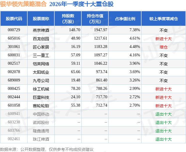 证券之星消息,日前银华领先策略混合基金公布一季报,2026年一季度最新规模2.64亿元,季度净值涨幅为-6.58%。