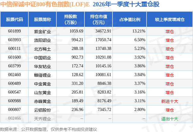 从基金规模来看,中信保诚中证800有色指数(LOF)E基金2026年一季度公布的基金规模为0.21亿元。该基金最新一期资产配置为:股票占净值比94.03%,无债券类资产,现金占净值比5.58%。从基金持仓来看,该基金当季前十大股票仓位达49.0%,第一大重仓股为紫金矿业(601899),持仓占比为13.21%。