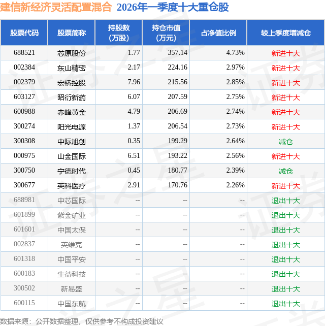 从基金规模来看,建信新经济灵活配置混合基金2026年一季度公布的基金规模为0.76亿元,较上一期规模1.17亿元变化了-4187.64万元,环比变化了-35.66%。该基金最新一期资产配置为:股票占净值比66.48%,无债券类资产,现金占净值比33.86%。从基金持仓来看,该基金当季前十大股票仓位达28.62%,第一大重仓股为芯原股份(688521),持仓占比为4.73%。