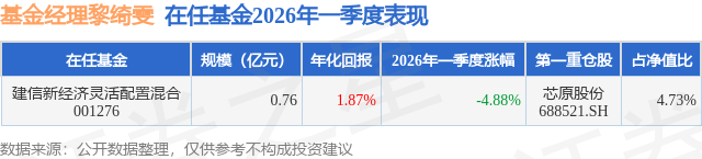证券之星消息,日前建信新经济灵活配置混合基金公布一季报,2026年一季度最新规模0.76亿元,季度净值涨幅为-4.88%。