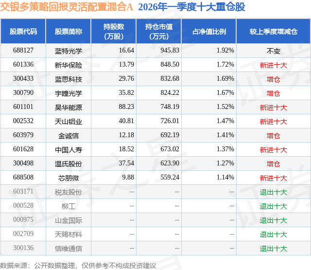 从基金规模来看,交银多策略回报灵活配置混合A基金2026年一季度公布的基金规模为2.69亿元,较上一期规模2.93亿元变化了-2401.02万元,环比变化了-8.19%。该基金最新一期资产配置为:股票占净值比22.33%,债券占净值比81.97%,现金占净值比0.89%。从基金持仓来看,该基金当季前十大股票仓位达15.18%,第一大重仓股为蓝特光学(688127),持仓占比为1.92%。