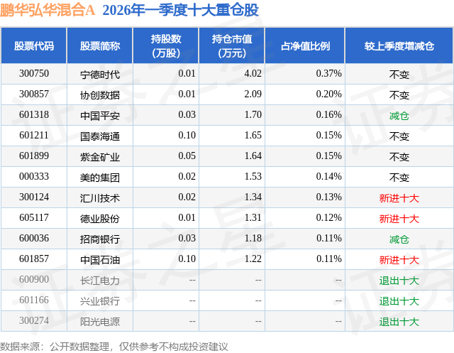 从基金规模来看,鹏华弘华混合A基金2026年一季度公布的基金规模为0.03亿元,较上一期规模436.38万元变化了-136.5万元,环比变化了-31.28%。该基金最新一期资产配置为:股票占净值比6.17%,无债券类资产,现金占净值比93.92%。从基金持仓来看,该基金当季前十大股票仓位达1.64%,第一大重仓股为宁德时代(300750),持仓占比为0.37%。