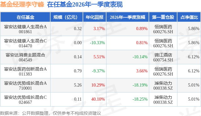 富安达优势成长混合A现任基金经理为李守峰,本季度增聘基金经理李守峰,近期离任的基金经理为申坤。其中在任基金经理李守峰已从业10年又122天,2026年1月30日正式接手管理富安达优势成长混合A,任职期间累计回报为-1.82%。目前还管理着6只基金产品(包括A类和C类),其中本季度表现最佳的基金为富安达医药创新混合A(011383),季度净值涨幅为3.66%。