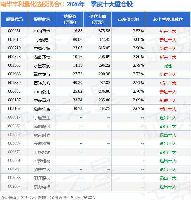 从基金规模来看,南华丰利量化选股混合C基金2026年一季度公布的基金规模为0.81亿元。该基金最新一期资产配置为:股票占净值比80.86%,债券占净值比7.71%,现金占净值比1.02%。从基金持仓来看,该基金当季前十大股票仓位达28.66%,第一大重仓股为中国重汽(000951),持仓占比为3.53%。