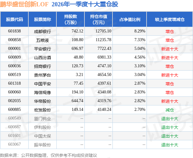 从基金规模来看,鹏华盛世创新LOF基金2026年一季度公布的基金规模为10.6亿元,较上一期规模8.18亿元变化了2.42亿元,环比变化了29.59%。该基金最新一期资产配置为:股票占净值比82.0%,无债券类资产,现金占净值比18.43%。从基金持仓来看,该基金当季前十大股票仓位达42.58%,第一大重仓股为成都银行(601838),持仓占比为8.29%。