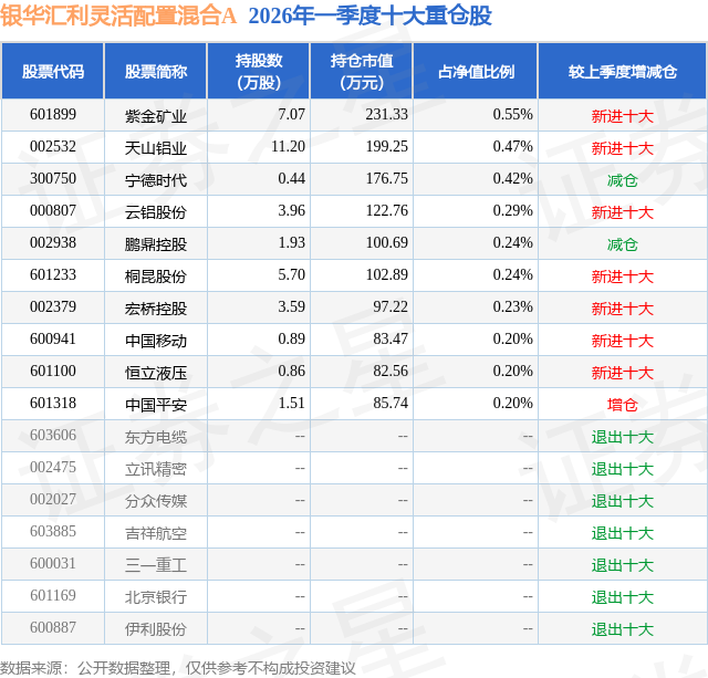 从基金规模来看,银华汇利灵活配置混合A基金2026年一季度公布的基金规模为3.65亿元,较上一期规模5.14亿元变化了-1.5亿元,环比变化了-29.12%。该基金最新一期资产配置为:股票占净值比5.7%,债券占净值比123.88%,现金占净值比4.42%。从基金持仓来看,该基金当季前十大股票仓位达3.04%,第一大重仓股为紫金矿业(601899),持仓占比为0.55%。