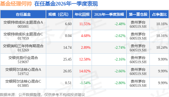 从基金规模来看,交银优势行业混合基金2026年一季度公布的基金规模为25.45亿元,较上一期规模37.19亿元变化了-11.74亿元,环比变化了-31.56%。该基金最新一期资产配置为:股票占净值比77.75%,债券占净值比5.95%,现金占净值比17.19%。从基金持仓来看,该基金当季前十大股票仓位达64.77%,第一大重仓股为贵州茅台(600519),持仓占比为9.99%。
