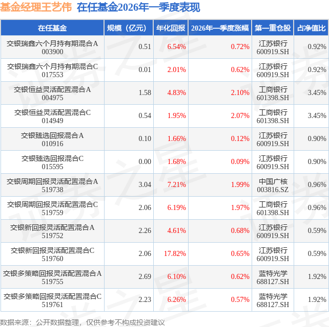 证券之星消息,日前交银新回报灵活配置混合A基金公布一季报,2026年一季度最新规模2.26亿元,季度净值涨幅为0.68%。