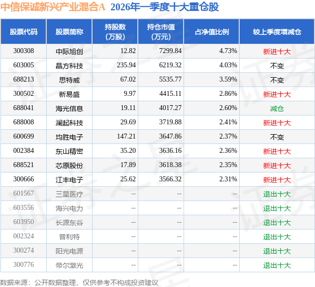 证券之星消息,日前中信保诚新兴产业混合A基金公布一季报,2026年一季度最新规模14.88亿元,季度净值涨幅为4.2%。