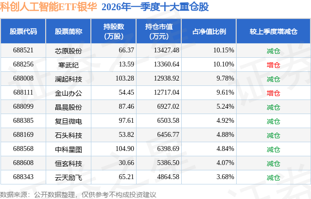 从基金规模来看,科创人工智能ETF银华基金2026年一季度公布的基金规模为13.23亿元,较上一期规模16.8亿元变化了-3.57亿元,环比变化了-21.24%。该基金最新一期资产配置为:股票占净值比99.44%,无债券类资产,现金占净值比0.63%。从基金持仓来看,该基金当季前十大股票仓位达67.27%,第一大重仓股为芯原股份(688521),持仓占比为10.15%。