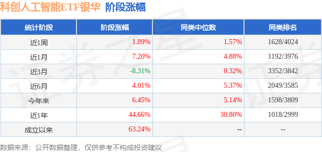 从业绩表现来看,科创人工智能ETF银华基金过去一年净值涨幅为44.66%,在同类基金中排名1018/2999,同类基金过去一年净值涨幅中位数为30.8%。而基金过去一年的最大回撤为-21.89%,成立以来的最大回撤为-24.97%。