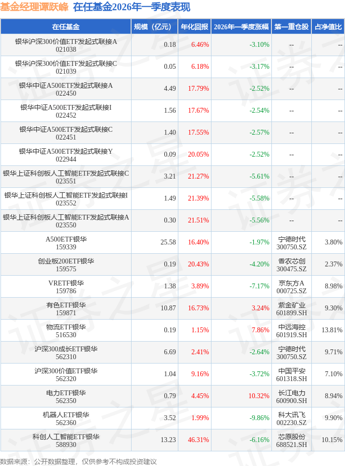 证券之星消息,日前科创人工智能ETF银华基金公布一季报,2026年一季度最新规模13.23亿元,季度净值涨幅为-6.16%。