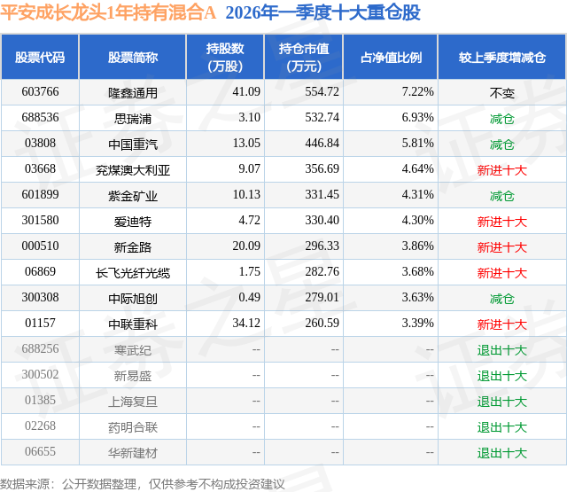 从基金规模来看,平安成长龙头1年持有混合A基金2026年一季度公布的基金规模为0.56亿元,较上一期规模6866.43万元变化了-1227.11万元,环比变化了-17.87%。该基金最新一期资产配置为:股票占净值比88.99%,债券占净值比1.71%,现金占净值比9.92%。从基金持仓来看,该基金当季前十大股票仓位达47.77%,第一大重仓股为隆鑫通用(603766),持仓占比为7.22%。