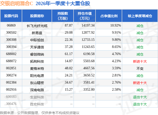从基金规模来看,交银启明混合C基金2026年一季度公布的基金规模为0.46亿元,较上一期规模9477.58万元变化了-4874.38万元,环比变化了-51.43%。该基金最新一期资产配置为:股票占净值比93.95%,债券占净值比6.25%,现金占净值比2.96%。从基金持仓来看,该基金当季前十大股票仓位达60.01%,第一大重仓股为长飞光纤光缆(06869),持仓占比为10.92%。