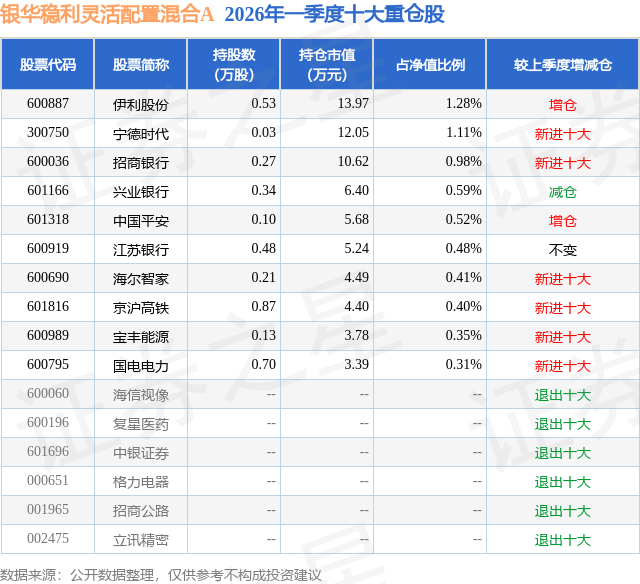 证券之星消息,日前银华稳利灵活配置混合A基金公布一季报,2026年一季度最新规模0.02亿元,季度净值涨幅为1.11%。