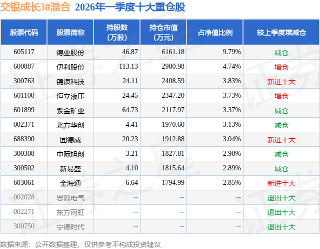 从基金规模来看,交银成长30混合基金2026年一季度公布的基金规模为6.29亿元,较上一期规模8.87亿元变化了-2.58亿元,环比变化了-29.09%。该基金最新一期资产配置为:股票占净值比71.94%,无债券类资产,现金占净值比28.99%。从基金持仓来看,该基金当季前十大股票仓位达40.27%,第一大重仓股为德业股份(605117),持仓占比为9.79%。