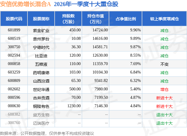 从基金规模来看,安信优势增长混合A基金2026年一季度公布的基金规模为7.42亿元,较上一期规模6.77亿元变化了6541.13万元,环比变化了9.67%。该基金最新一期资产配置为:股票占净值比91.05%,债券占净值比1.45%,现金占净值比7.82%。从基金持仓来看,该基金当季前十大股票仓位达74.23%,第一大重仓股为紫金矿业(601899),持仓占比为9.96%。