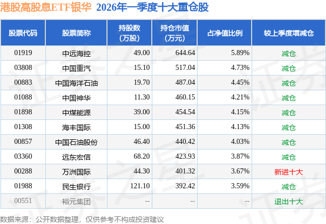 从基金规模来看,港股高股息ETF银华基金2026年一季度公布的基金规模为1.09亿元,较上一期规模1.53亿元变化了-4326.99万元,环比变化了-28.34%。该基金最新一期资产配置为:股票占净值比97.99%,无债券类资产,现金占净值比2.15%。从基金持仓来看,该基金当季前十大股票仓位达42.72%,第一大重仓股为中远海控(01919),持仓占比为5.89%。