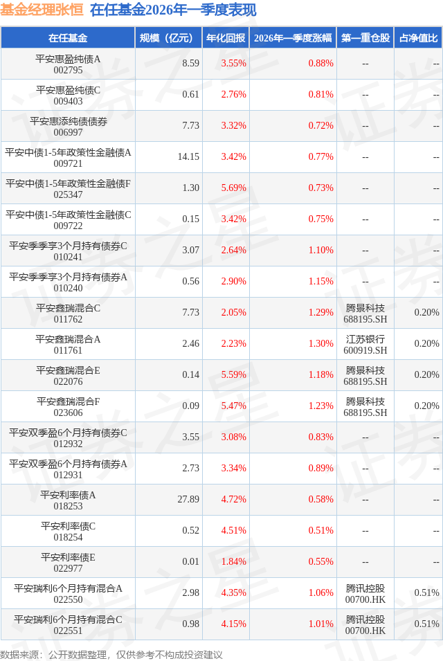 证券之星消息,日前平安鑫瑞混合F基金公布一季报,2026年一季度最新规模0.09亿元,季度净值涨幅为1.23%。