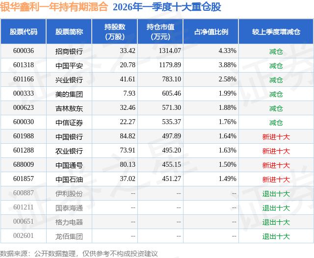 从基金规模来看,银华鑫利一年持有期混合基金2026年一季度公布的基金规模为3.04亿元,较上一期规模6.83亿元变化了-3.79亿元,环比变化了-55.5%。该基金最新一期资产配置为:股票占净值比89.44%,无债券类资产,现金占净值比12.17%。从基金持仓来看,该基金当季前十大股票仓位达22.68%,第一大重仓股为招商银行(600036),持仓占比为4.33%。