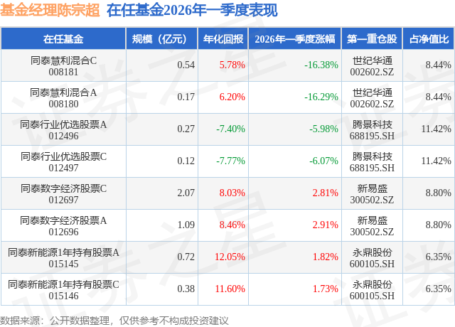 证券之星消息,日前同泰行业优选股票C基金公布一季报,2026年一季度最新规模0.12亿元,季度净值涨幅为-6.07%。