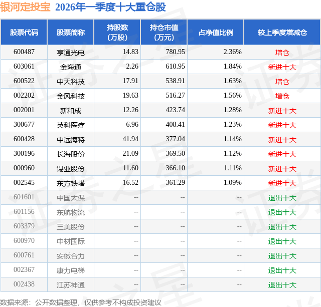 从基金规模来看,银河定投宝基金2026年一季度公布的基金规模为3.31亿元,较上一期规模3.05亿元变化了2595.33万元,环比变化了8.5%。该基金最新一期资产配置为:股票占净值比93.1%,无债券类资产,现金占净值比7.28%。从基金持仓来看,该基金当季前十大股票仓位达14.36%,第一大重仓股为亨通光电(600487),持仓占比为2.36%。