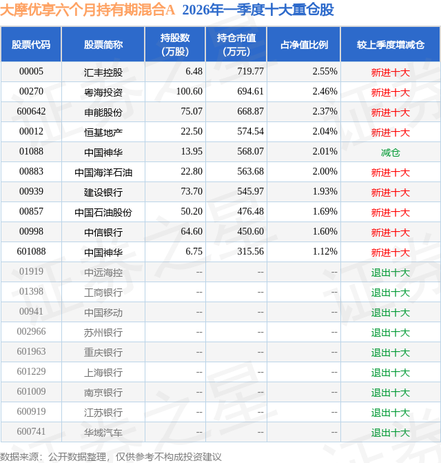 从基金规模来看,大摩优享六个月持有期混合A基金2026年一季度公布的基金规模为2.66亿元,较上一期规模3.45亿元变化了-7893.91万元,环比变化了-22.9%。该基金最新一期资产配置为:股票占净值比92.39%,债券占净值比5.03%,现金占净值比2.77%。从基金持仓来看,该基金当季前十大股票仓位达19.77%,第一大重仓股为汇丰控股(00005),持仓占比为2.55%。