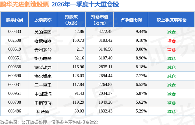 从基金规模来看,鹏华先进制造股票基金2026年一季度公布的基金规模为3.47亿元,较上一期规模2.91亿元变化了5570.91万元,环比变化了19.14%。该基金最新一期资产配置为:股票占净值比93.59%,无债券类资产,现金占净值比6.09%。从基金持仓来看,该基金当季前十大股票仓位达75.92%,第一大重仓股为美的集团(000333),持仓占比为9.44%。
