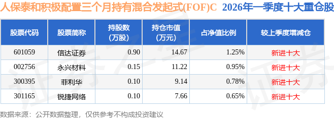 从基金规模来看,人保泰和积极配置三个月持有混合发起式(FOF)C基金2026年一季度公布的基金规模为0.0亿元。该基金最新一期资产配置为:股票占净值比3.63%,债券占净值比4.31%,现金占净值比7.7%。从基金持仓来看,该基金当季前十大股票仓位达3.63%,第一大重仓股为信达证券(601059),持仓占比为1.25%。