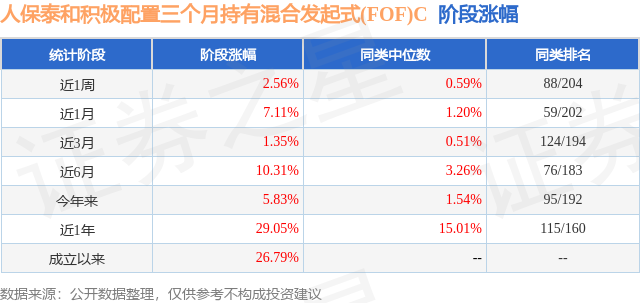 证券之星消息,日前人保泰和积极配置三个月持有混合发起式(FOF)C基金公布一季报,2026年一季度最新规模0.0亿元,季度净值涨幅为-2.9%。
