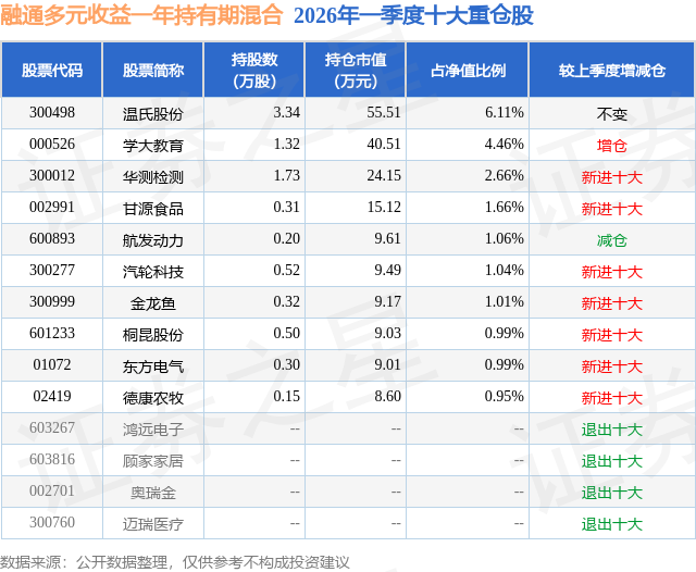 从基金规模来看,融通多元收益一年持有期混合基金2026年一季度公布的基金规模为0.09亿元,较上一期规模2066.55万元变化了-1157.81万元,环比变化了-56.03%。该基金最新一期资产配置为:股票占净值比26.06%,债券占净值比66.2%,现金占净值比13.48%。从基金持仓来看,该基金当季前十大股票仓位达20.93%,第一大重仓股为温氏股份(300498),持仓占比为6.11%。
